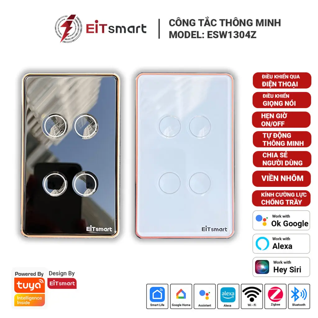 Công tắc thông minh: bật/tắt đèn qua ứng dụng, hẹn giờ hoặc điều khiển bằng giọng nói.